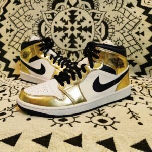 O Air Jordan 1 Mid SE “Metallic Gold” é uma versão chamativa do lendário primeiro tênis assinado por Michael Jordan, agora em sua versão de cano médio. Lançado em novembro de 2020, o Special Edition (SE) “Metallic Gold” dá continuidade à paixão da Jordan Brand pelo luxuoso tema metálico, já utilizado anteriormente em modelos icônicos como o Air Force 1, Air Max 1 e Jordan 1. Quanto ao design deste tênis, painéis de couro branco liso na biqueira perfurada e no painel lateral formam a base do cabedal. Sobreposições de couro em dourado metálico aparecem no antepé, ilhós, colarinho e calcanhar, conferindo um visual premium ao Jordan 1 Mid. Em outros detalhes, o couro preto aparece nas laterais e o logo “Wings” também em preto na gola. Cadarços pretos adornam a lingueta de nylon branca, que por sua vez apresenta uma etiqueta também de nylon branca com o clássico logo Jumpman. O Air Jordan 1 Mid SE “Metallic Gold” é um lançamento da Jordans Brand para o final de 2020. Data de lançamento: 30 de novembro de 2020.