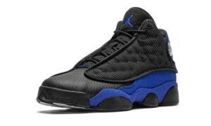 O Air Jordan 13 GS “Hyper Royal” é a versão infantil do décimo terceiro tênis assinado por Michael Jordan, com uma estampa semelhante à do modelo Player Exclusive usado por Quentin Richardson no Orlando Magic. O “Hyper Royal” não possui a marca “Q-Rich” presente no Air Jordan 13 PE de Richardson, mas o visual ainda transmite a mesma energia da cobiçada colorway não original. Os detalhes incluem couro preto na biqueira e um cabedal em mesh preto com bolinhas e material refletivo que brilha no escuro quando exposto à luz. Esse elemento de design foi inspirado na versão original “Bred” do Jordan 13, usada por Michael no Chicago Bulls. A camurça Hyper Royal pode ser encontrada no para-lama e no calcanhar. Um emblema holográfico aparece na gola e um Jumpman azul bordado é costurado na língua preta. Data de lançamento: 19 de dezembro de 2020.