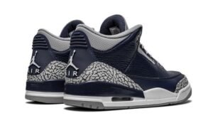 O Air Jordan 3 “Georgetown” é um lançamento de março de 2021 do terceiro tênis assinado por Michael Jordan, em uma colorway inspirada no time de basquete universitário Georgetown Hoyas. Extraoficialmente, o “Georgetown” homenageia a potência do basquete universitário, utilizando as cores do uniforme da equipe em seu design. O visual faz referência a muitas das colorways exclusivas “Georgetown” concedidas aos membros da família Hoya pela Jordans Brand. Os detalhes incluem um cabedal em couro granulado azul-marinho com painéis contrastantes em couro cinza-cimento com detalhes em bolinhas nos ilhós, na gola e na língua. A clássica estampa de elefante aparece no calcanhar e na ponta do tênis, seguindo o estilo original do Air Jordan 3. Outros detalhes de design incluem um Jumpman bordado em azul marinho na língua de couro cinza, cadarços brancos e um Jumpman branco no calcanhar. Uma unidade Air visível no calcanhar da entressola branca completa o visual desta edição “Georgetown” do Jordan 3. Data de lançamento: 20 de março de 2021.