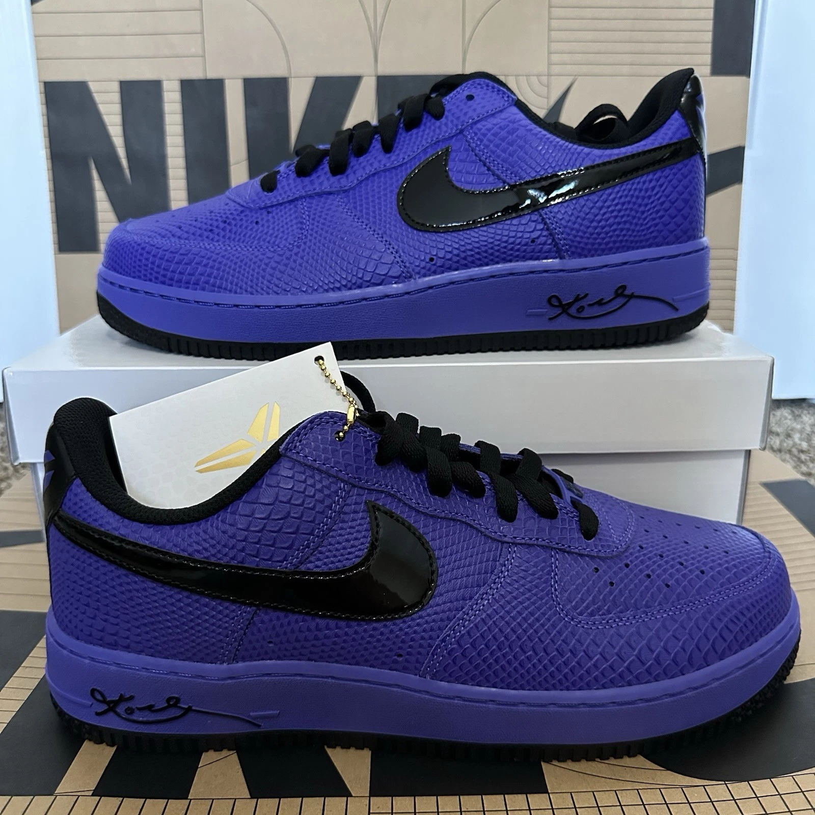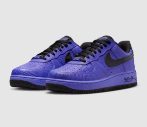 Em colaboração com o FC Barcelona, este Kobe Air Force 1 Low Protro apresenta o logotipo do clube no dubrae e na língua, além de uma palmilha especial que homenageia o lendário time. O cabedal é feito de couro premium com textura de pele de cobra — uma homenagem à Mamba Negra — e apresenta as cores do uniforme do FC Barcelona para 2025: Violeta Persa e Preto.