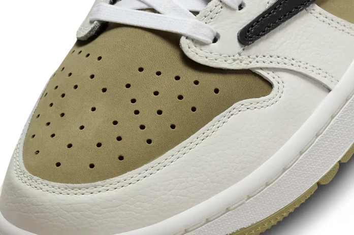O Travis Scott x Air Jordan O modelo 1 Low Golf ‘Neutral Olive’ atualiza a silhueta icônica com uma construção reformulada, feita para o campo de golfe. Uma etiqueta Jordan Golf tecida se destaca na língua em um tom verde limão, combinando com os logotipos Cactus Jack e Jordan Wings que adornam a aba traseira do pé esquerdo e direito.